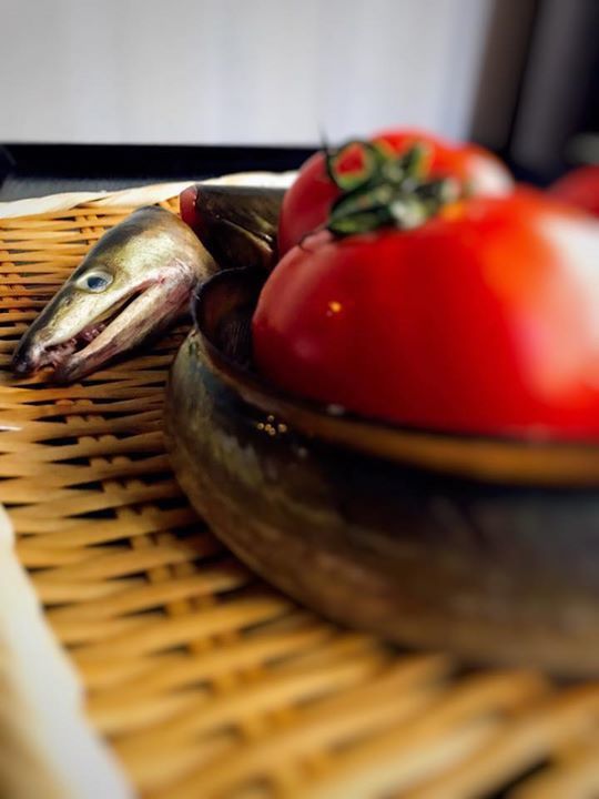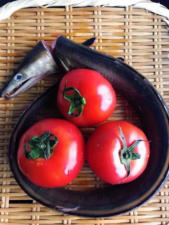 小さいので骨も柔らか。皮目を焼いた焼き霜造りでお出しします。トマトで作るトマト醤油を添えて。