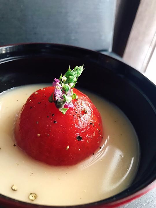 下味を入れたトマトを盛りつけ、地を張って穂紫蘇を飾り、胡椒をひと捻りして完成。