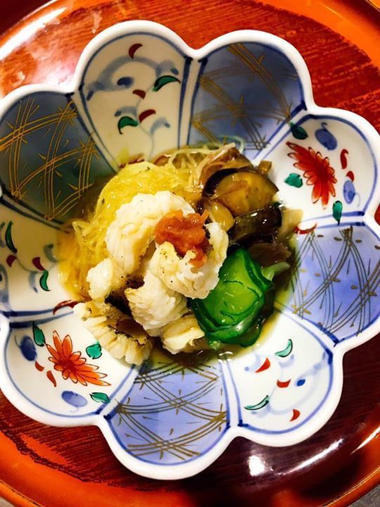 炭火で炙り香りをつけた鱧と素麺南瓜、胡瓜、水茄子、茗荷などを加減酢で和えました。