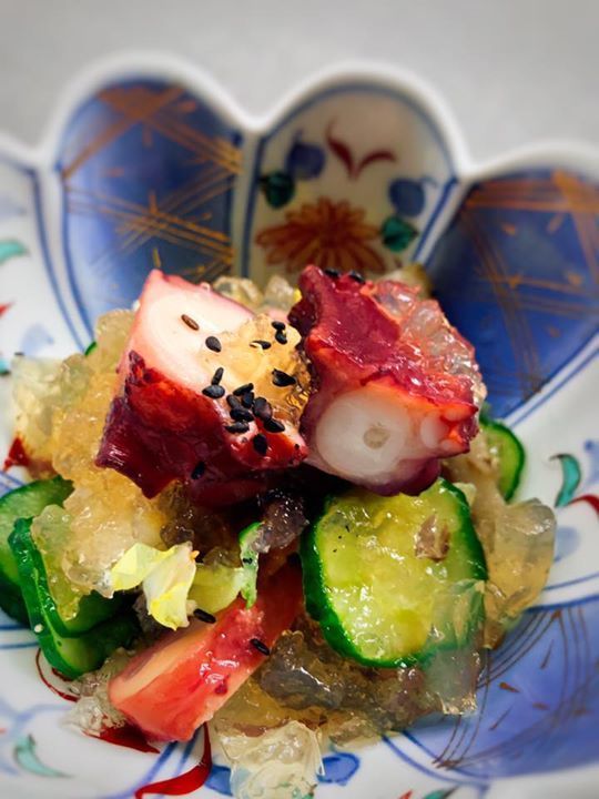 本日は塩ポン酢をジュレにした物で、蛸、胡瓜、叩き牛蒡、長芋を和えました。アッサリと頂けます。