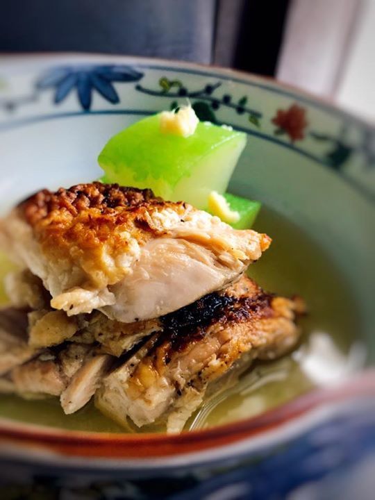 何色にも染まる冬瓜に鶏の旨味を含ませた煮物です。