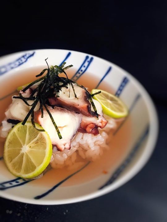炊いたお米洗ってヌメリを取って器に盛り、柔らか煮にしたタコと味を調え冷やしたタコ出汁をかけて酢橘と海苔をのせて完成。