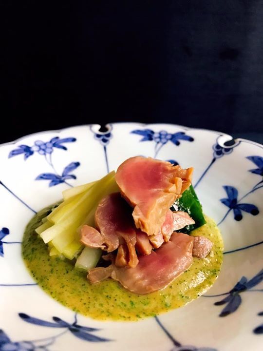 低温調理の砂肝と黄ニラに酢橘を効かせた酢味噌を合わせました。