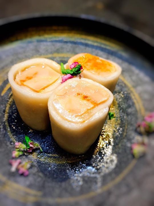味噌漬けにしたアン肝を千枚漬けで巻いた酒肴です。