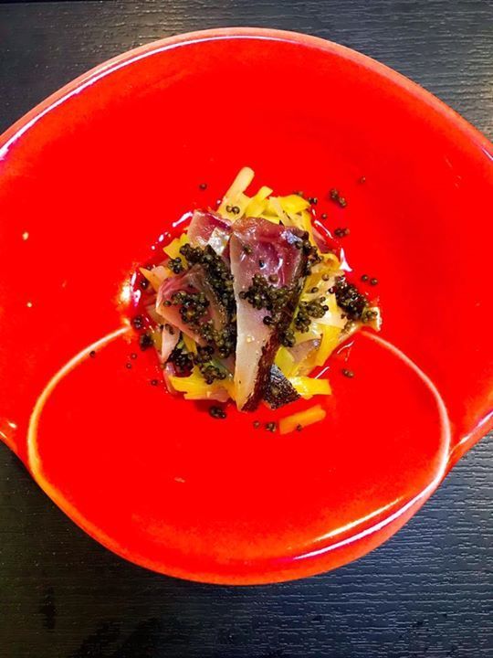 脂ののったサバと黄ニラの甘味を和芥子が引き締めます。