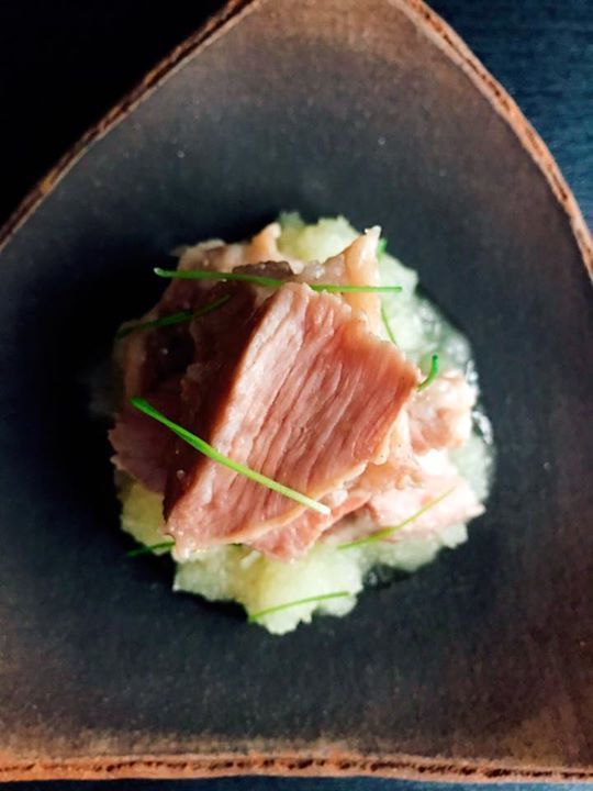 葛粉を塗して、しっとりと蒸した豚肉に、