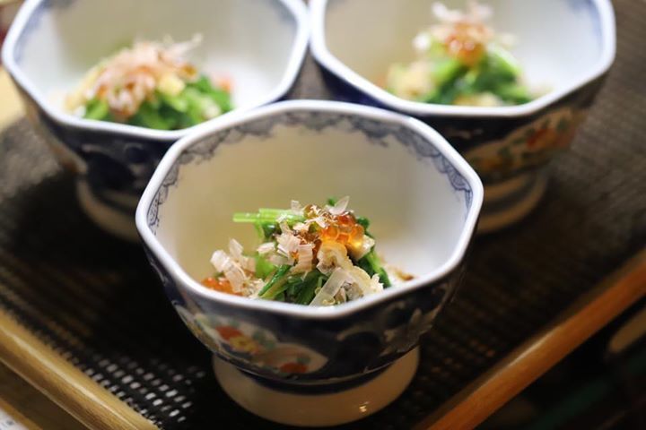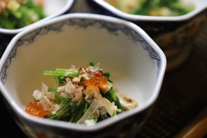 シャキッと仕上げた壬生菜にイクラを掛けて先付けにしました〜。