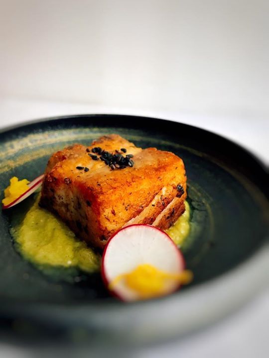 焼いたセロリに煮切りの酒と薄口醤油を合わせペーストにした、爽やかなソースを合わせました。